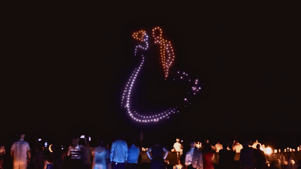 بفضل رقص الباليه الجوي المتزامن مع الموسيقى، هؤلاء عروض ضوء الطائرات بدون طيار إنشاء أشكال مذهلة: الأحرف الأولى من اسمي العروس والعريس، والقلوب، وخواتم الزفاف البراقة…بديل حديث وصديق للبيئة للألعاب النارية.