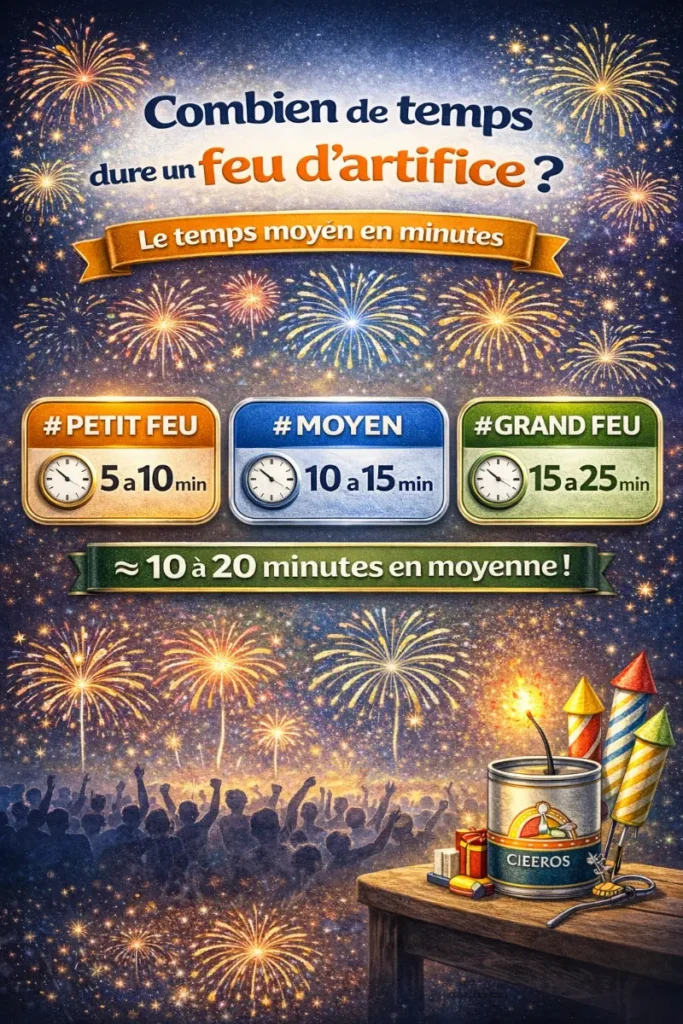 En règle générale un feu d’artifice dure entre 5 et 15 minutes pour la plupart des événements. Un détail important explique pourquoi la durée varie selon le public et le site.